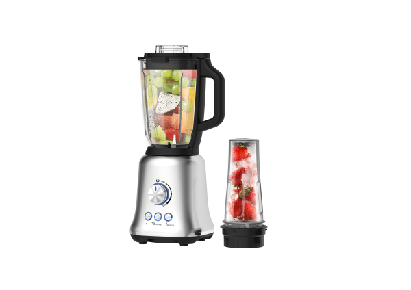 The blender features a modern and sophisticated design, with multiple manually adjustable speed levels via a control knob, making it very user-friendly.