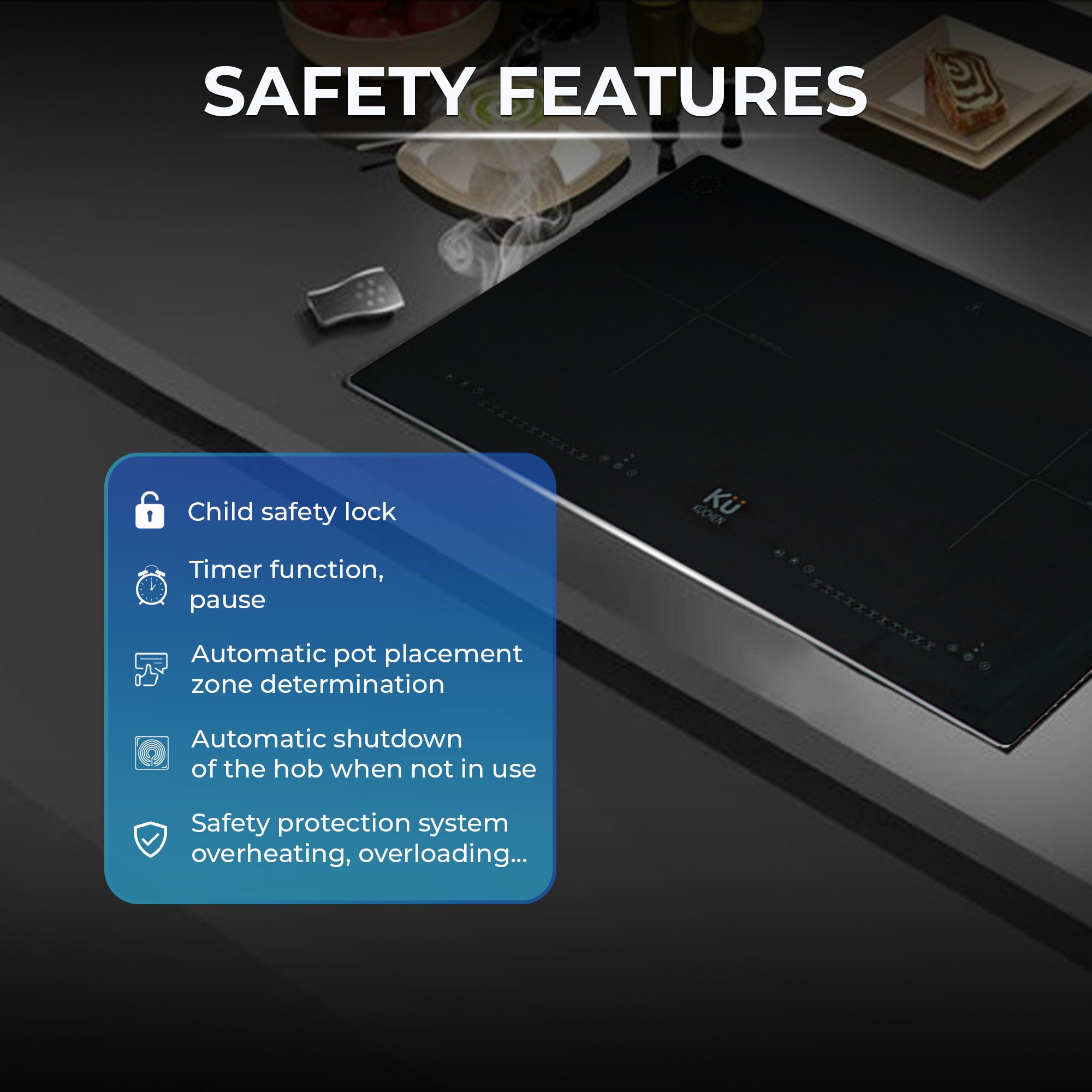Child lock, auto shut-off when no pan is detected, and overflow protection safeguard both the hob and the user.