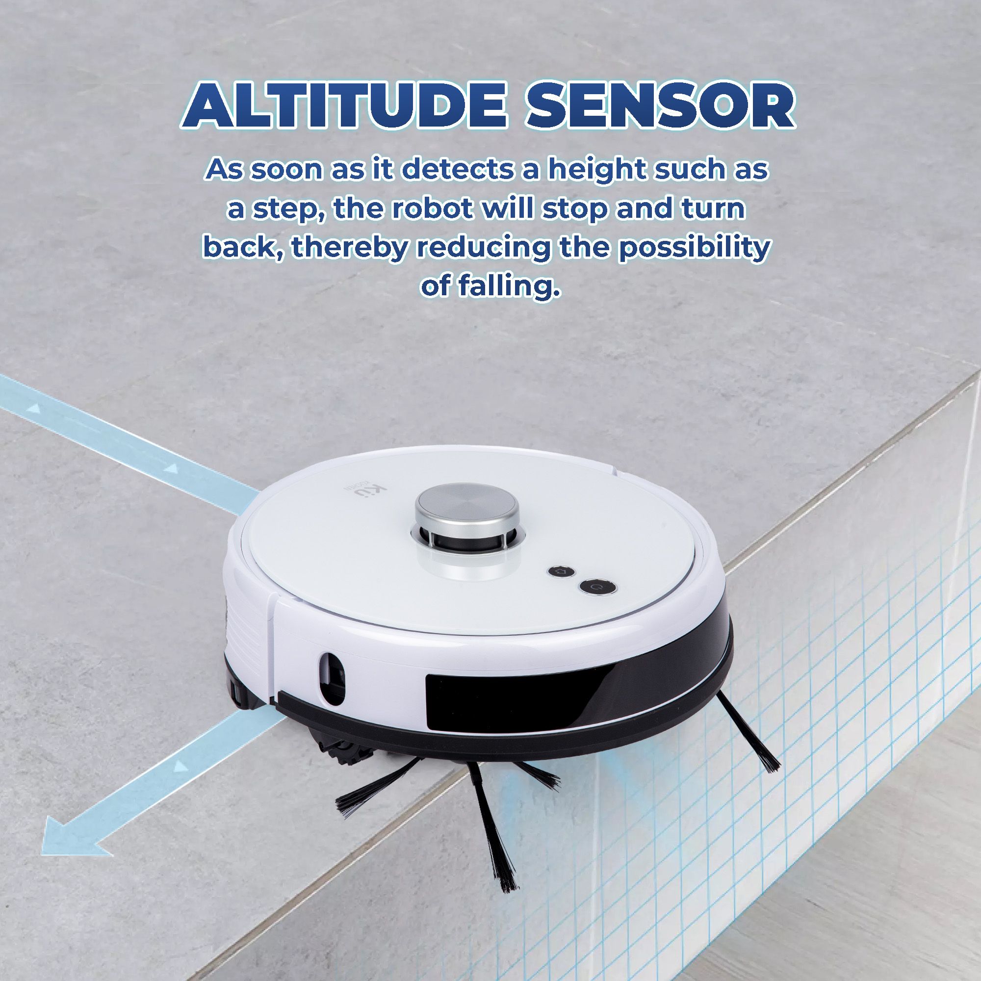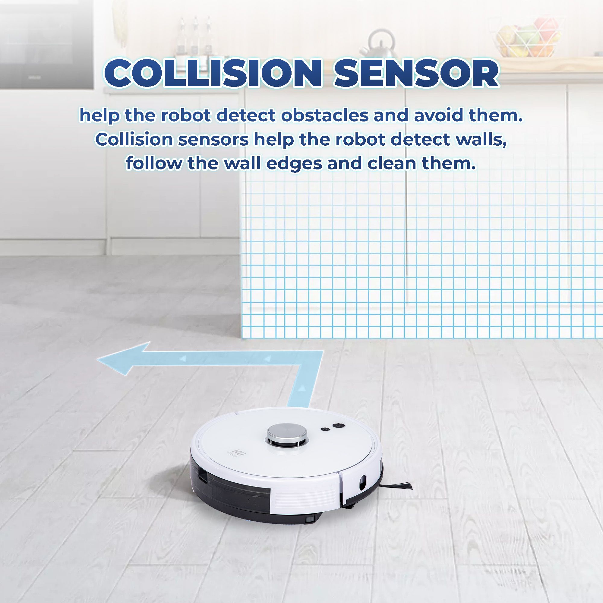 Height sensors prevent falls and protect the device. Collision sensors help the robot detect obstacles and avoid collisions. It also detects walls, following edges for maximum cleaning.