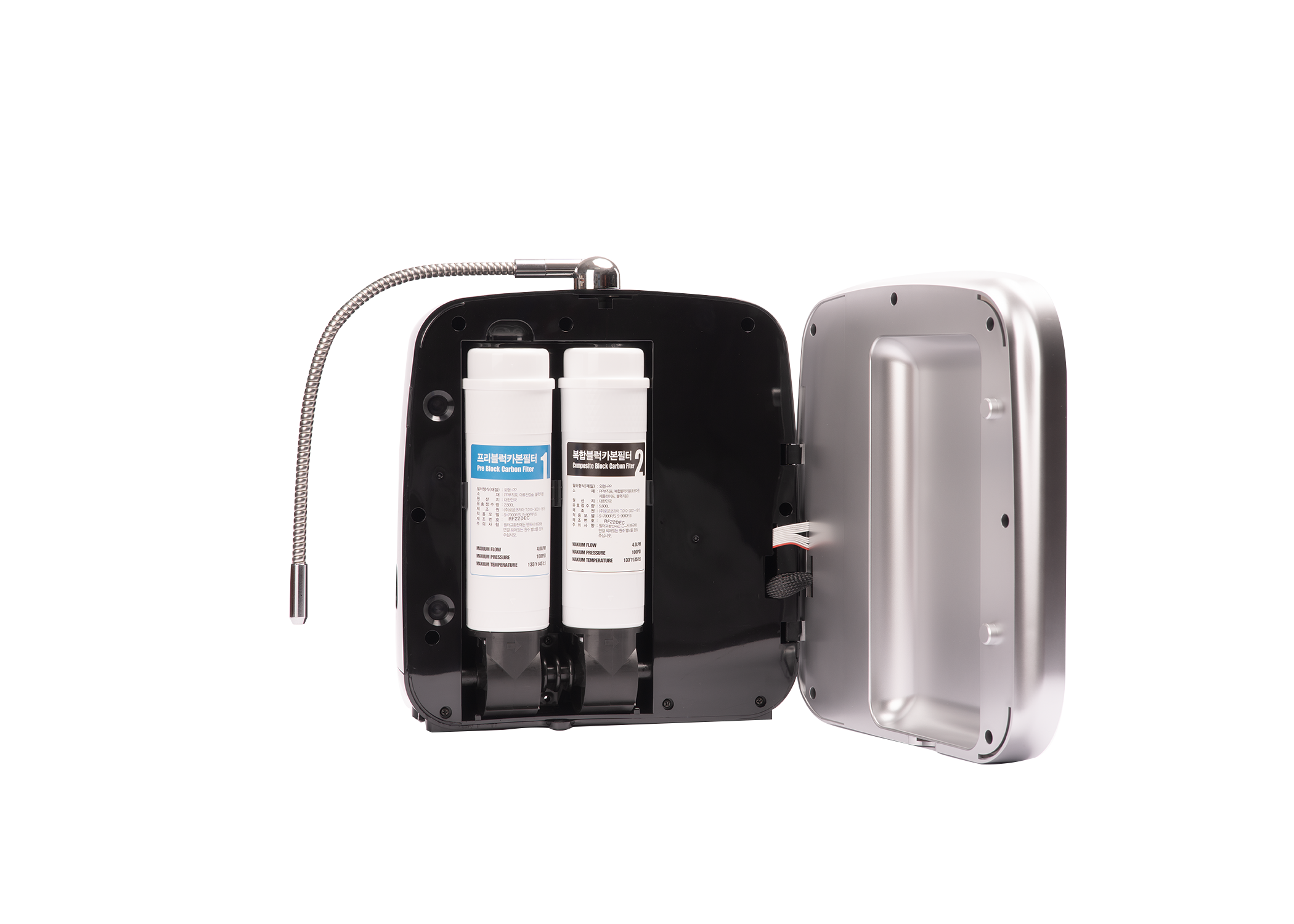 • Two solid block carbon filters (3-stage) that remove 99.99% of bacteria and impurities while retaining essential natural minerals.